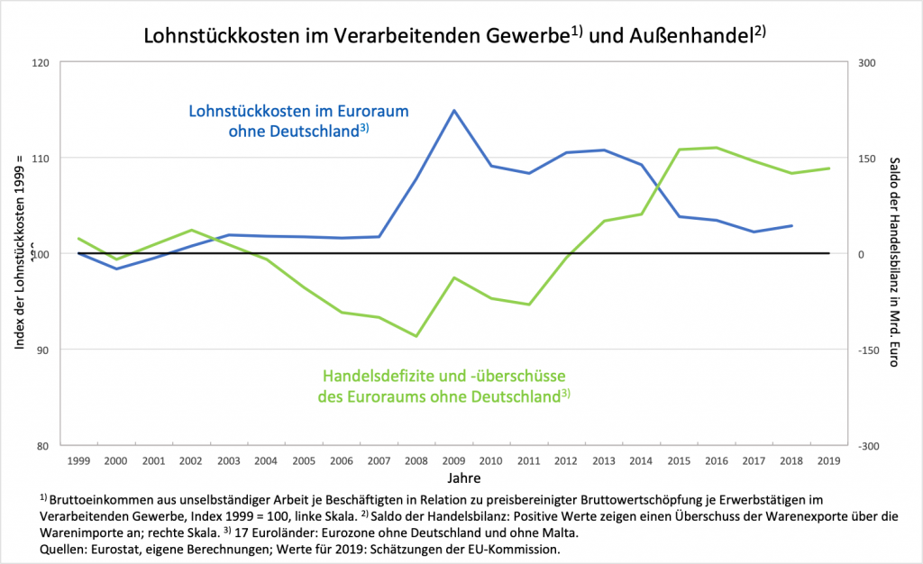 Lohndumping ist selbstverständlich dann ein besonders gravierender und ungerechtfertigter Eingriff in den internationalen Handel, wenn sich die Handelspartner in einer Währungsunion zusammengeschlossen haben. Ohne diese Währungsunion werden unterschiedliche Entwicklungen der Kosten- und Preisniveaus von Wechselkursänderungen ausgeglichen oder können es zumindest werden, was Lohndumping von vorneherein unsinnig macht. Mit Währungsunion gibt es dieses Ventil zwischen den Unionsmitgliedern nicht (mehr), was notwendigerweise zu Spannungen führt, wenn ein Mitglied dieses „Instrument“ einsetzt, statt sich an die wichtigste Spielregel der Währungsunion zu halten, nämlich an das gemeinsam vereinbarte Inflationsziel.