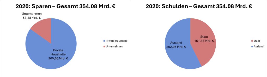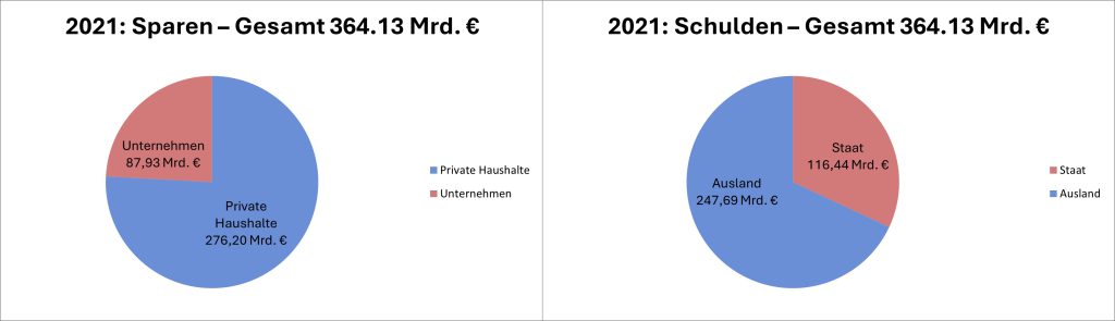 The best and most logically compelling way to link the state and its debt level to the rest of the economy is through what are known as sectoral financial balances. They show at a glance how the revenue and expenditure deficits of individual sectors are interrelated throughout the economy and throughout the world. Anyone in this world who wants to achieve a surplus of income over expenditure, i.e. who wants to save (i.e. live below their means), needs a counterpart somewhere in the world who does exactly the opposite, i.e. spends more than they earn (i.e. living beyond their means). If they cannot find such a counterpart, they must cut back on their savings plans, or the overall economic income (and their income) will fall to such an extent that they will be forced to reduce their savings plans.