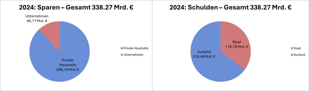 Since the 1950s, the Deutsche Bundesbank has been calculating the financing balances for Germany on the basis of national accounts and other available indicators (albeit with total disregard by the top officials). The latest calculation dates from June of this year and covers the year 2024 as the last available result. I am trying to present the balances today in a different way so that it is clear at a glance that savings and debt are two sides of the same coin. At the same time, these images show very clearly that the state can never separate itself from the rest of the economy and that any analysis that assumes this is pointless from the outset.