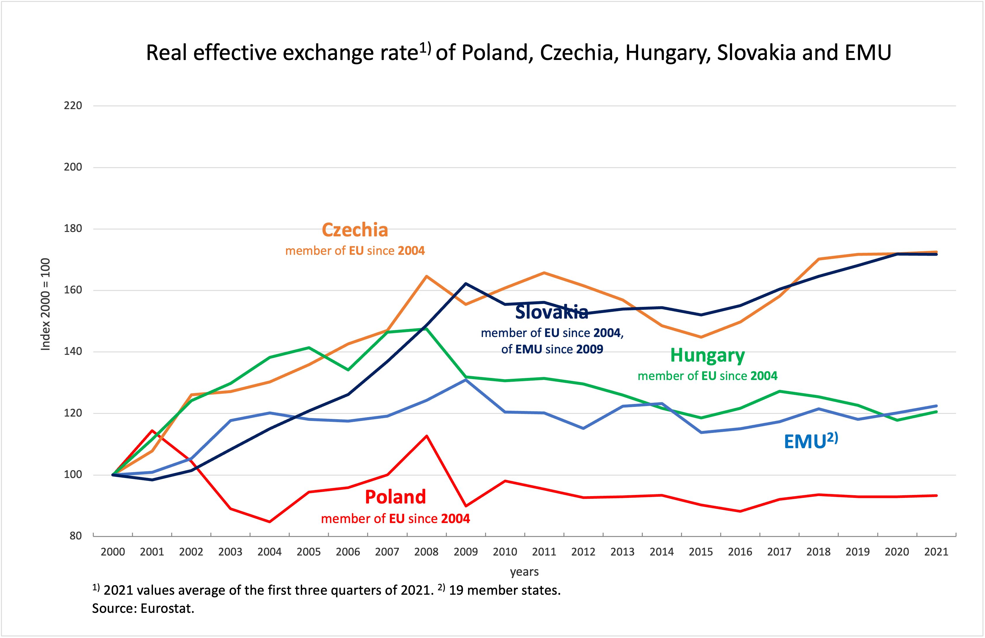 And this is the problem of Eastern Europe: What should justify the fact that all companies in these economies are constantly facing declining competitiveness? Or to put it another way: How can it be that the development of the nominal exchange rates of the countries with independent currencies and the price levels of the countries that have introduced the euro has for years been such that, on average, their companies cannot keep up on the international markets?