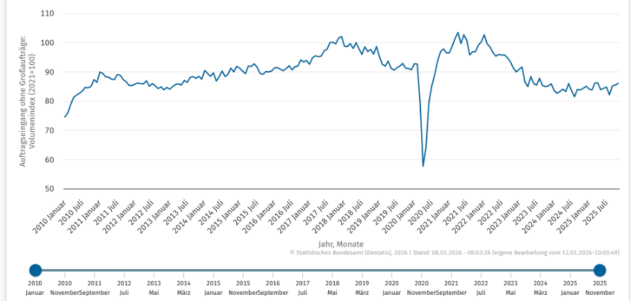 Even after some upward-trending data for November, the economic situation in Germany has not improved (figure from the Federal Statistical Office). Without large orders (from the military sector), total order intake in German industry remains at recession levels. Sentiment indicators even point to another setback in December.
