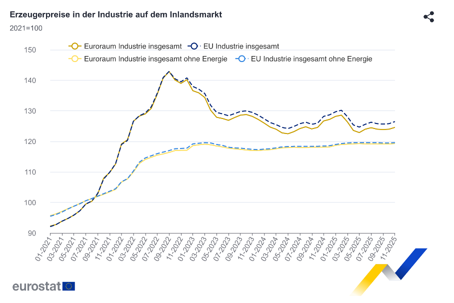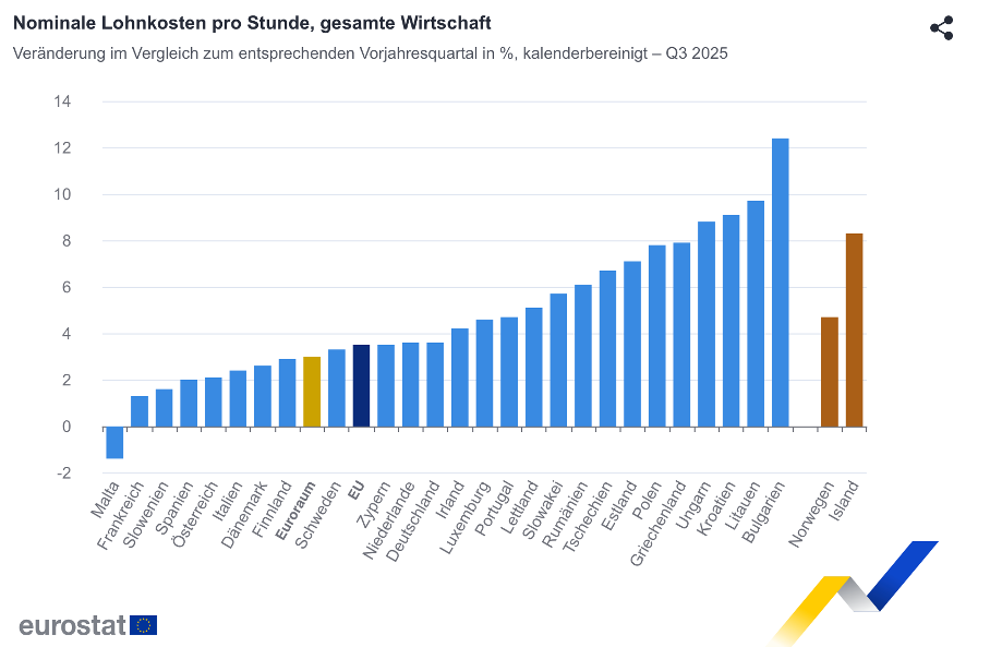However, the fact that a country like Bulgaria, which has just become a member of the Eurogroup, recorded a rise in labour costs of over 12 per cent in the third quarter of 2025 is further proof that this country was accepted into the monetary union solely for political reasons. Even producer prices are rising at double-digit rates in the country. The consequences will be dramatic, as recently described here.