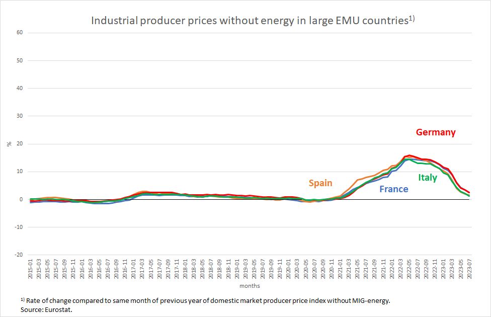 This development must be seen against the background that industrial companies in Germany and in the entire EMU are facing almost stagnating and in some cases falling prices and, in parallel, comparatively high interest rates. The differences in the development of producer prices between the four large EMU countries are mainly due to the energy sector, as can be seen from a comparison of Figures 5 and 6: Excluding energy, the growth rates of producer prices in Germany, France, Italy and Spain are almost parallel (Figure 6). The overall indices (Figure 5) thus differ largely only because of the development of producer prices in the energy sector. Incidentally, in this comparison of countries, Germany by no means shows the steepest price increase in the course of the energy price crisis.